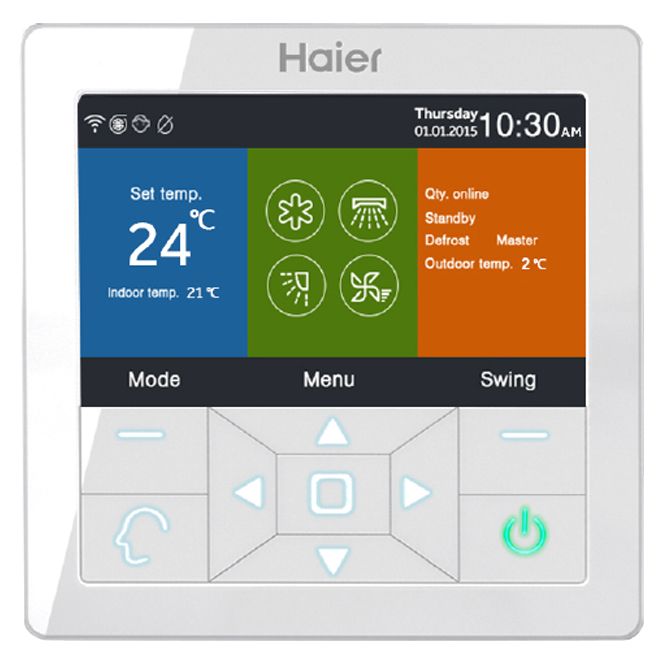 Проводной пульт управления Haier YR-E16B оснащен ярким цветным дисплеем, поэтому пользователю особенно удобно будет найти необходимую информацию о работе кондиционера или запрограммировать климатические оборудование. Устройство помогает не только упростить эксплуатацию сплит-системы, но и увеличить показатель ее производительности.